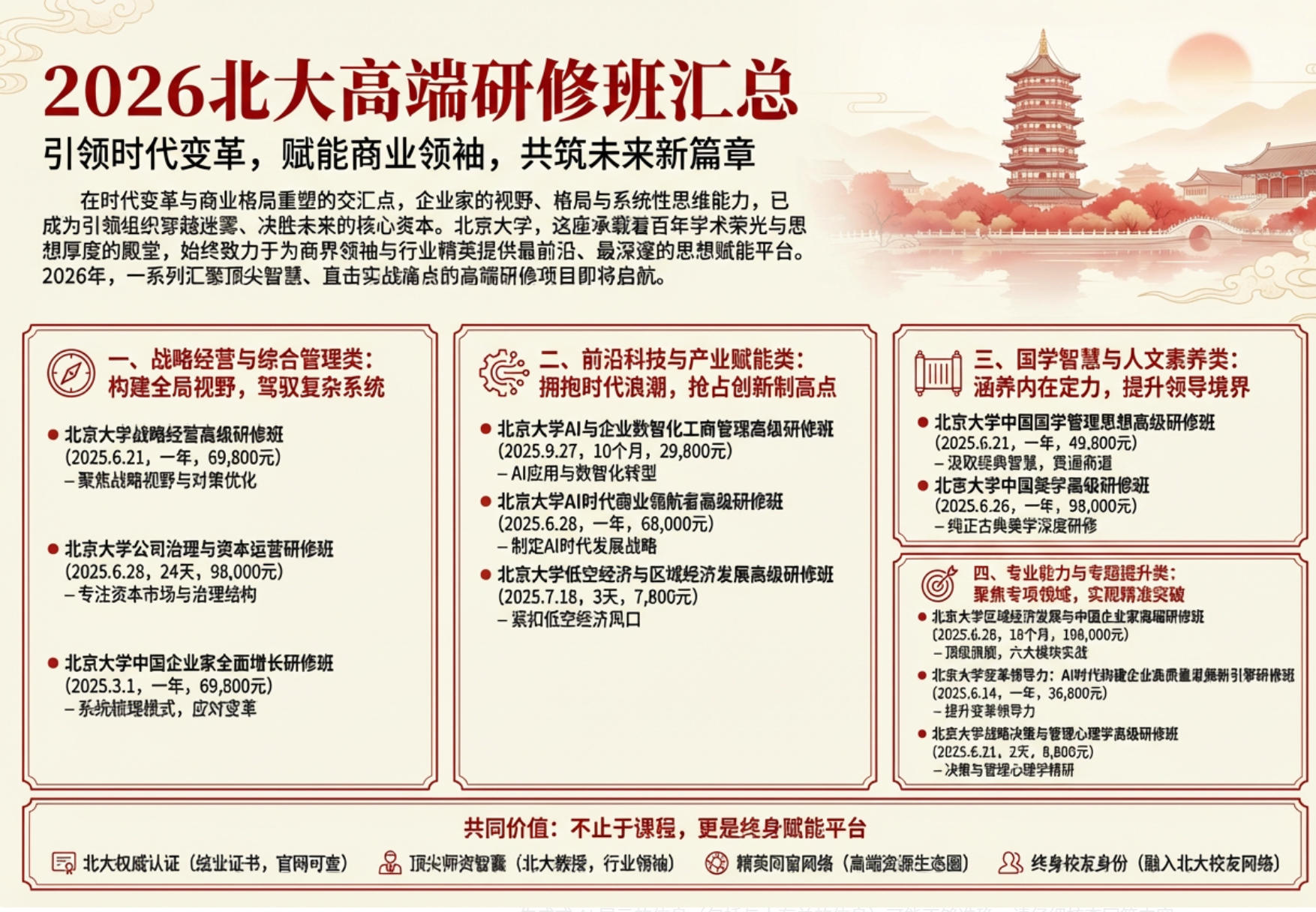在时代变革与商业格局重塑的交汇点,企业家的视野、格局与系统性思维能力,已成为引领组织穿越迷雾、决胜未来的核心资本。北京大学,这座承载着百年学术荣光与思想厚度的殿堂,始终致力于为商界领袖与行业精英提供最前沿、最深邃的思想赋能平台。2026年,一系列汇聚顶尖智慧、直击实战痛点的高端研修项目即将启航,旨在为奋进者点亮明灯,为领航者夯实根基。以下是对部分核心高端研修课程的精华梳理,助您锚定最适合的进阶之路。