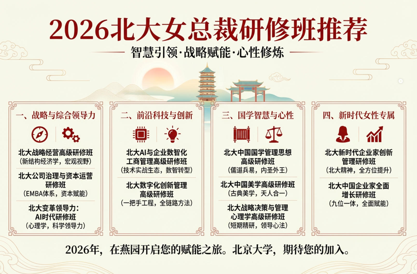 在商业浪潮中乘风破浪的女性领导者,不仅需要敏锐的商业嗅觉和卓越的管理才能,更需在战略思维、人文底蕴与内在心力上持续精进,以优雅而坚韧的姿态引领企业前行。北京大学,作为中国思想与学术的灯塔,为女性企业家量身打造了多维度的研修课程体系。2026年,若您是一位追求卓越、渴望突破的女总裁,以下几门深度融合智慧、战略与心性修炼的课程,将是您不容错过的选择。
