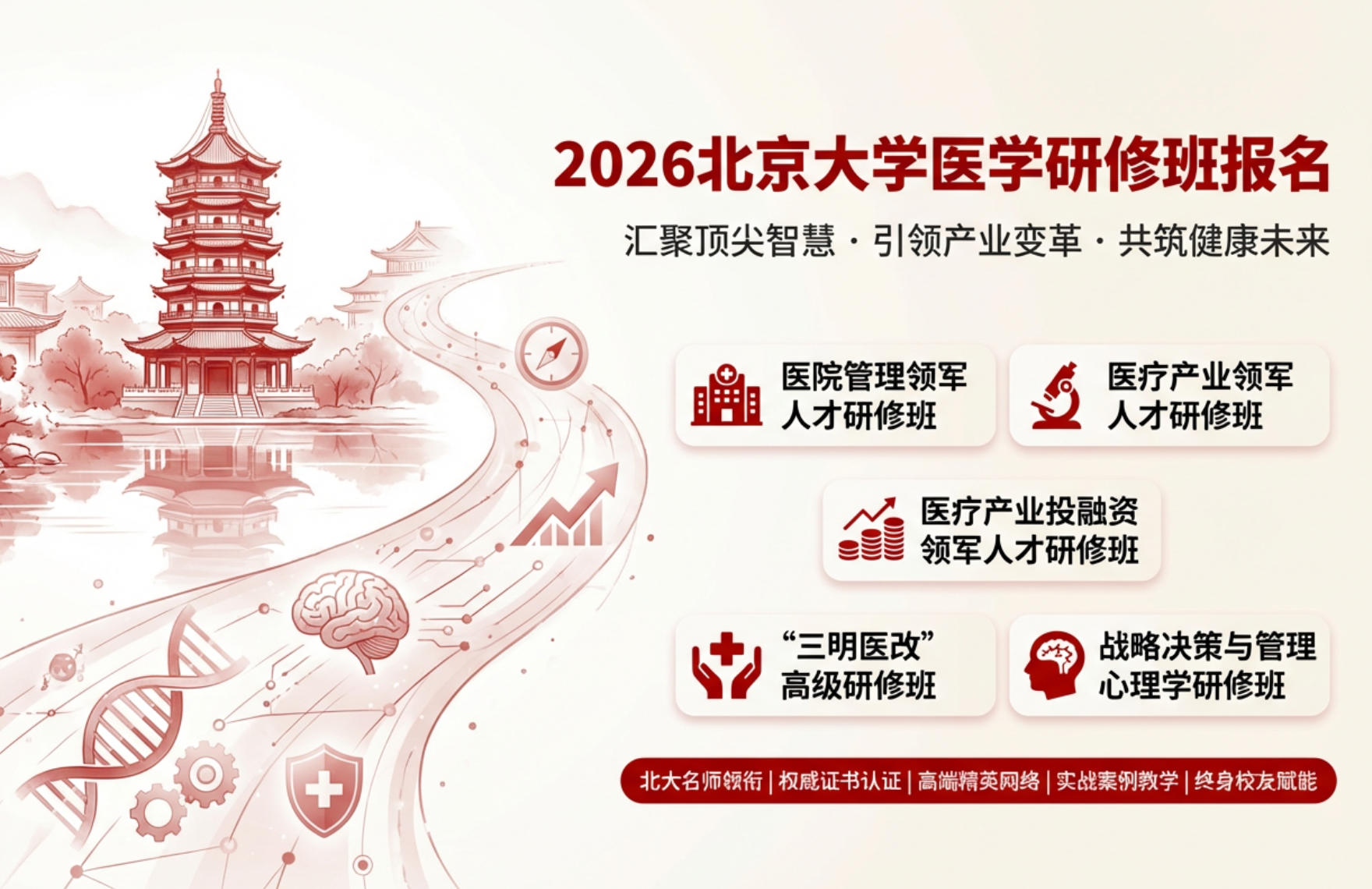 北京大学2026年的医学相关研修班,体系完备,覆盖从宏观产业到微观管理,从临床前沿到运营创新的多个维度,旨在满足不同层级、不同领域精英人士的进阶需求。